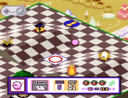 Scan the course and check out the obstacles ahead. Get ready for the most surprising game play imaginable in Kirby's battle against King Dedede!This checkboard challenge brings outrageous hazards and bizarre surfaces. Warp panels instantly transport you to new and exciting challenges. Conveyer belts provide higher levels of adventure. Turntables take the action in a whole new direction.Gordo, Kracko, Whispy Woods and a cast of zany characters await you. Gain special powers including Fireball, Freeze, Spark and Parasol. Transform your enemies into stars revealing eight hidden cups of each wildly different course. Control the force and angle of your shot and sink Kirby for a hole-in-one!
